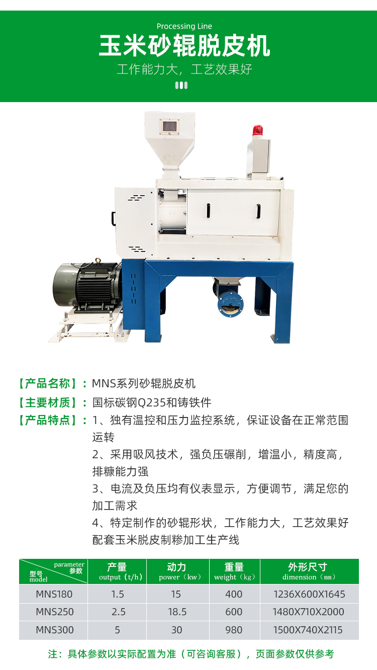 MNS系列玉米砂輥脫皮機是玉米加工廠干法脫皮的理想設(shè)備,本設(shè)備脫皮效果好,耗能低,產(chǎn)量高,密封性能好,無粉塵外揚。