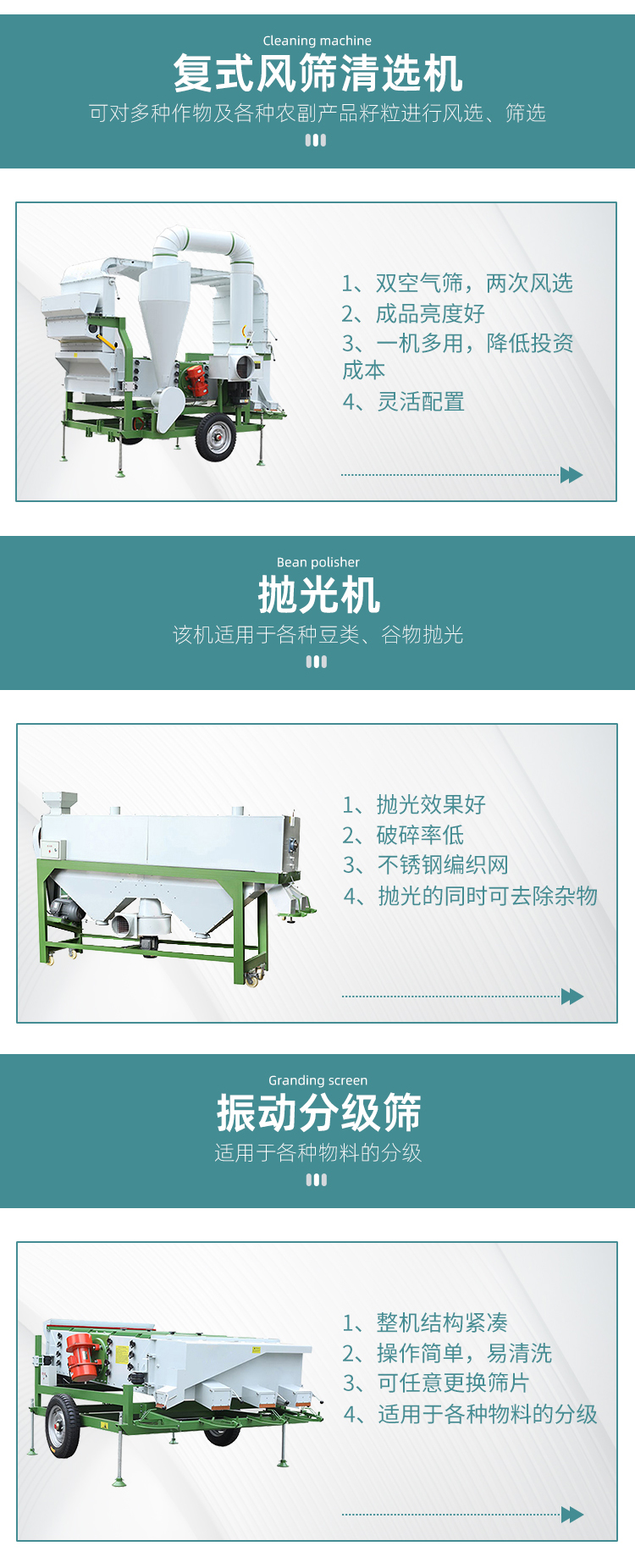 該豆類加工設(shè)備完成原糧提升,清理去雜去石、豆類分級(jí)等工序,出來的成品質(zhì)量完全能達(dá)到做精品小包裝的水平。本機(jī)組具有污染小,產(chǎn)量高,破碎率低的特點(diǎn),操作維護(hù)方便。