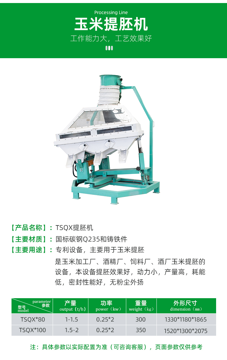 TSQX系列提胚機(jī)是玉米加工廠、酒精廠、飼料廠、酒廠玉米提胚的理想設(shè)備,該設(shè)備提胚效果好,動(dòng)力小,產(chǎn)量高,耗能低,密封性能好,無(wú)粉塵外揚(yáng)。