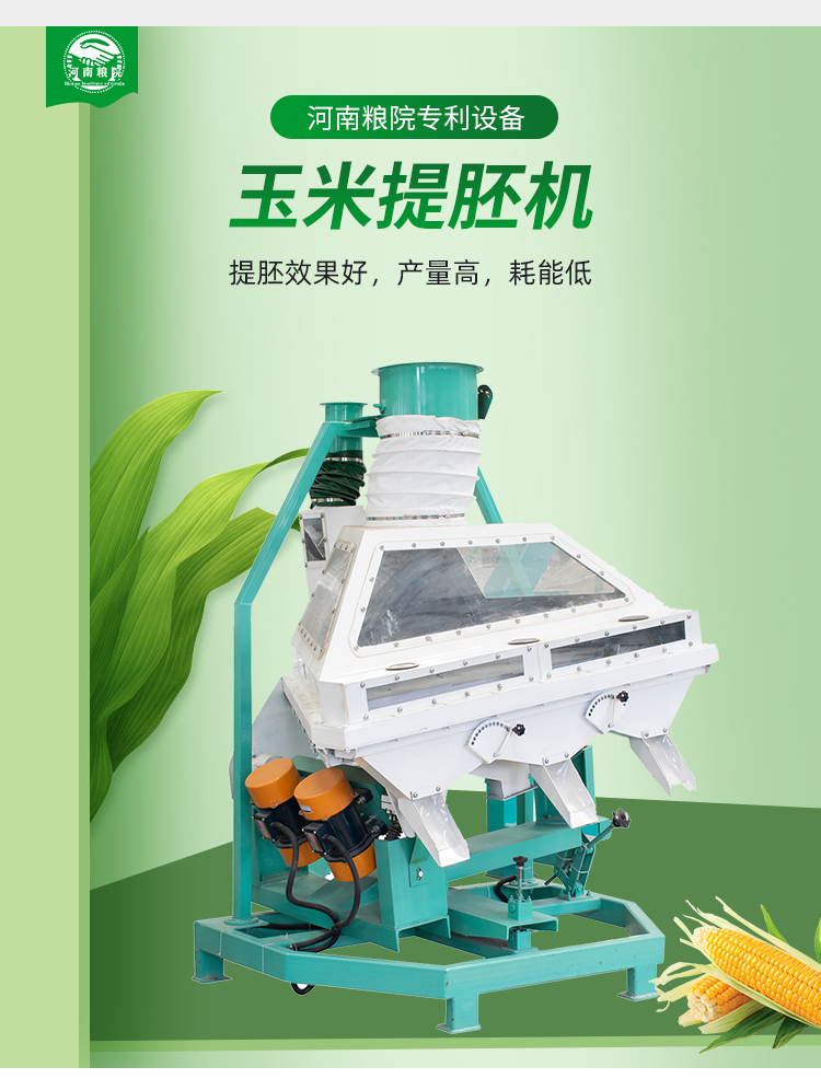 玉米營(yíng)養(yǎng)豐富可以制作成淀粉、制作糖、制作油等用途,玉米怎么制作玉米胚芽油呢,玉米胚芽含油40%左右,糧院機(jī)械研制的玉米提胚機(jī),玉米胚芽提取設(shè)備是提取粉碎后玉米中玉米胚芽的設(shè)備,能夠有效去取玉米中的玉米胚芽,進(jìn)料吸風(fēng)裝置主要包括進(jìn)料管、存料斗、流量調(diào)節(jié)機(jī)構(gòu)、導(dǎo)料淌板和出料口阻風(fēng)門等部件。整個(gè)裝置設(shè)在篩體的中部,以利于物料和氣流的分布。工作時(shí)物料由進(jìn)料管進(jìn)入存料斗,流量的大小由彈簧壓力門控制,壓力的調(diào)節(jié)借助拉緊或放松螺旋拉簧來調(diào)整。實(shí)際操作中存料斗中應(yīng)有一定的存料,以保證喂料連續(xù),避免漏風(fēng)。在吸風(fēng)罩頂蓋的前后,設(shè)有觀察操作門,便于觀察落料情況和清理篩板情況。