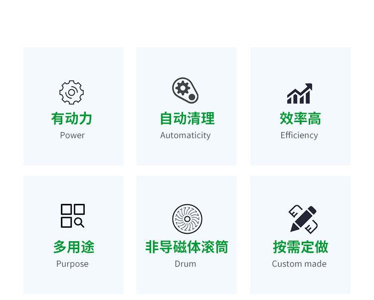 3、滾筒采用具有有色金屬制造,本身為非導(dǎo)磁體。有利于磁鐵分離。
