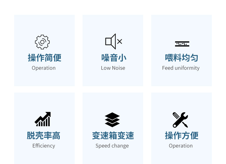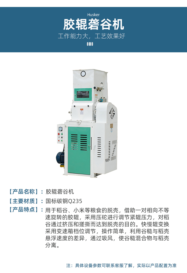 用于稻谷、小米等糧食的脫殼,借助一對(duì)相向不等速旋轉(zhuǎn)的膠輥,采用壓砣進(jìn)行調(diào)節(jié)緊輥壓力,對(duì)稻谷通過(guò)擠壓和搓撕而達(dá)到脫殼的目的?炻?zhàn)儞Q采用變速箱檔位調(diào)節(jié),操作簡(jiǎn)單,利用谷糙與稻殼懸浮速度的差異,通過(guò)吸風(fēng),使谷糙混合物與稻殼分離。