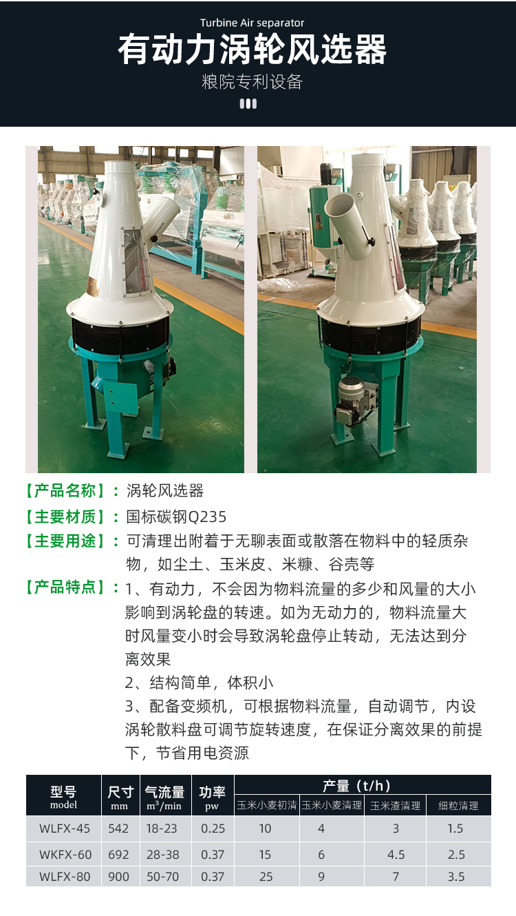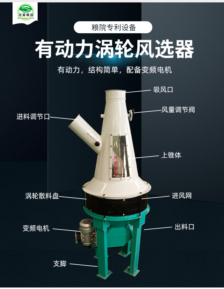 有動力渦輪風選機是我院研發(fā)的新型皮糠分選器,運用了側(cè)口可調(diào)節(jié)進物料、上口可調(diào)節(jié)排雜質(zhì)、中部渦輪散料盤和補風以及下料等原理。