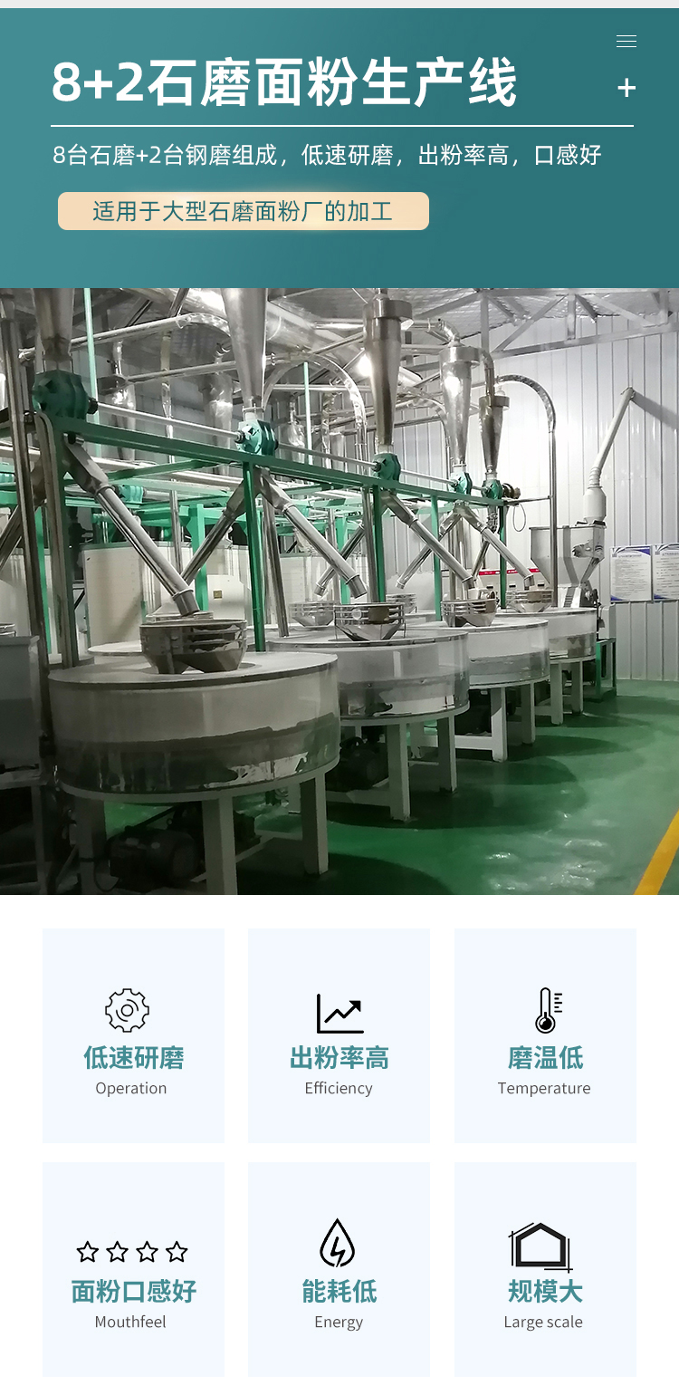 8+2石磨面粉加工成套設(shè)備轉(zhuǎn)速低、磨溫低,不會(huì)破壞小麥中的營養(yǎng)物質(zhì),改設(shè)備有效提高出粉率,適用于大型石磨面粉廠的加工,磨出來的面粉是天然面粉,不含任何添加劑,口感好,營養(yǎng)價(jià)值高,用石磨磨粉,能夠避免大型機(jī)械生產(chǎn)面粉時(shí)高溫高壓對面粉營養(yǎng)的破壞,從而更多地保留了面粉中的營養(yǎng)成分。